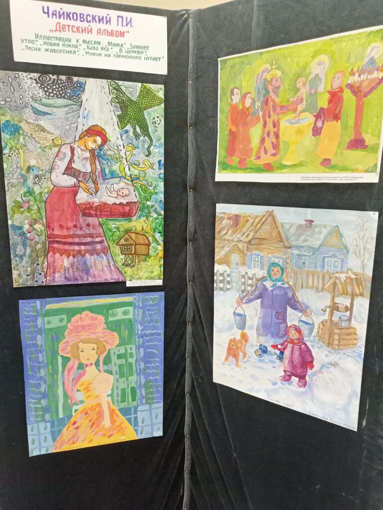 Выставка работ учащихся художественного отделения — иллюстрации к пьесам П.И. Чайковского из цикла «Детский Альбом».